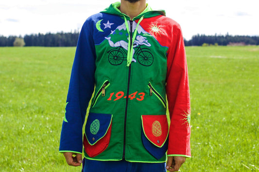 Albert Hofmann Bicycle Day UV jacket - handmade in any size - blacklight active 4 pockets with hoody and flower of life embroidery