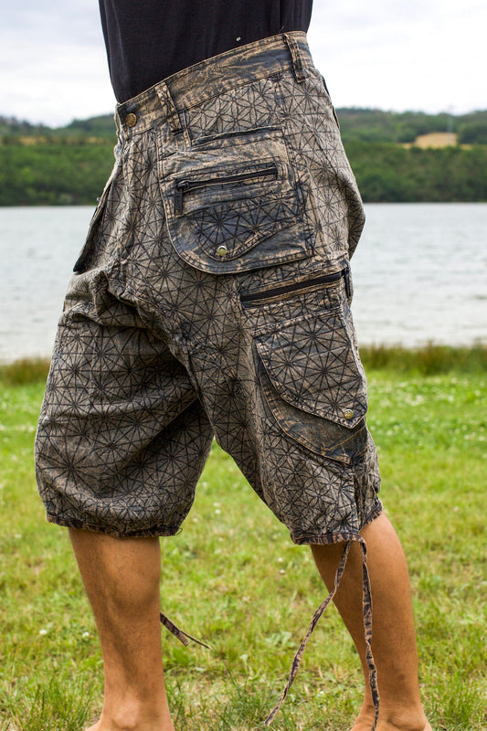 Asanoha Hemp pattern Pants - 2 in 1 Flower of Life shorts and long pants - 9 pockets handmade sacred cannabis geometry clamdiggers